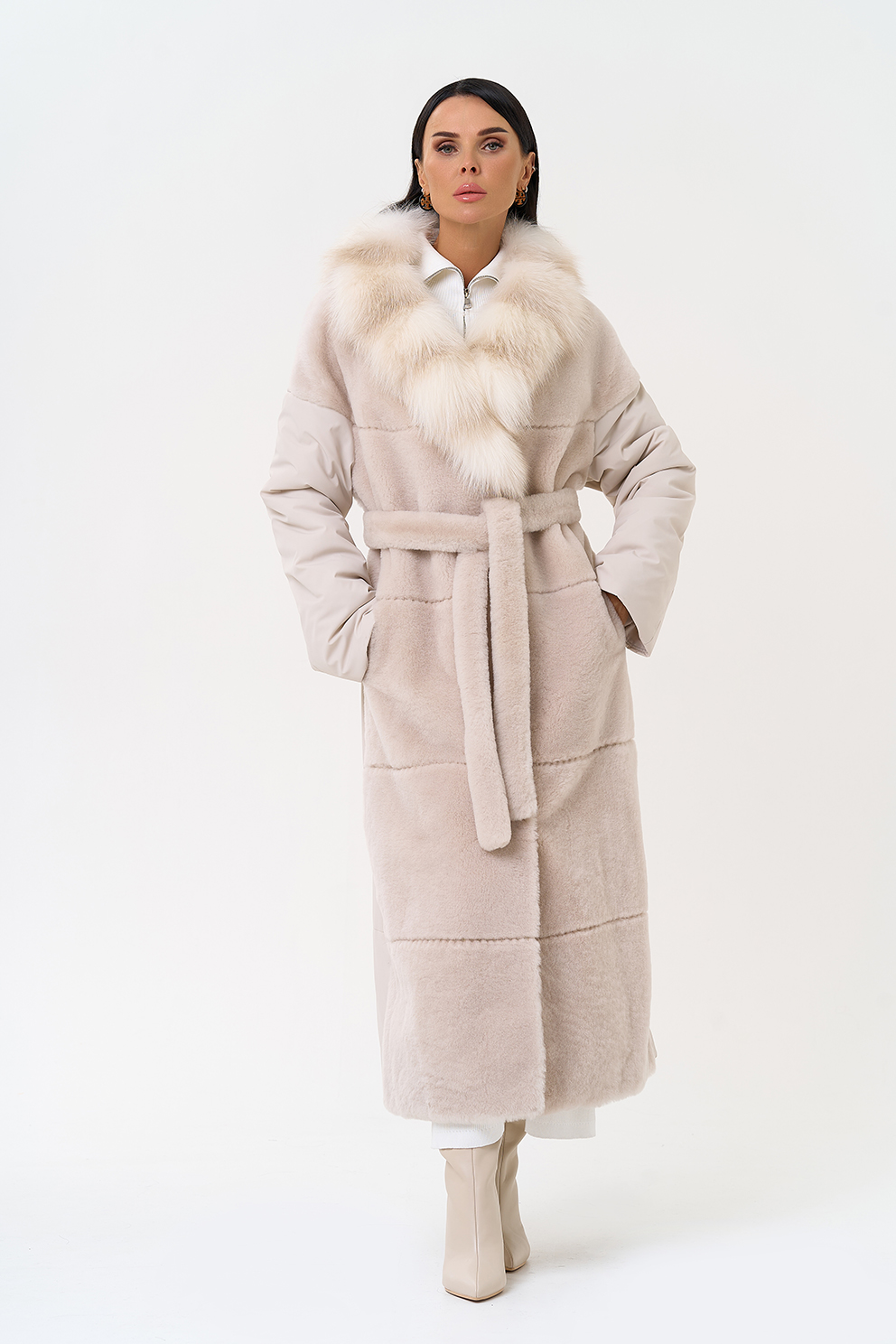 Вид застежки - кнопки, пояс из меха овчины